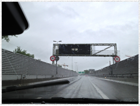 Eine Stunde später erreicht der Tross Zürich. Ich habe nasse Füsse. Ich wollte doch von einem Rastplatz noch einen Blick auf den Bodensee werfen, aber der Bach, der mal ein Weg war hat die Wattiefe meiner Schuhe überschritten. Wuschelkopf war schlauer und hat sch nach 2 Schritten ins trockene Auto getrollt.