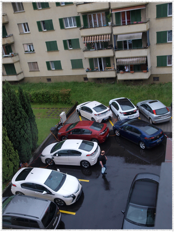 Im Dunkel (Dramatization! Es dämmert gerade) sehe ich Schemen durch den Regen huschen. Die Fahrer versuchen alle Autos an die grosse Verteilung zu klemmen. Ein Durcheinander von Licht und Schatten. Aber so Chaotisch dies Wirk, alles ich wohl geordnet und Choreographiert. Rufe erschallen: „Wer lädt noch mit 16A?“ „Nein, nicht Phase 1 nehmen, nimm Phase 3!“. Unterbrochen werden die Rufe durch das Stakkato des „Ladeverlustalarm“ eines Volts oder Ampera. Die Sicherung war überlastet. Er hat doch Phase 1 genommen!