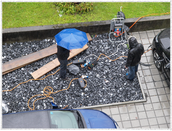 Ladeboxen in verschiedenen Ausführungen werden so gut es geht mit Brettern, Schirmen oder unter Autos vor dem Regen geschützt. Eine Erkenntnis bringt dieser Tag - die GM-Ladeboxen sind wirklich Waserdicht!