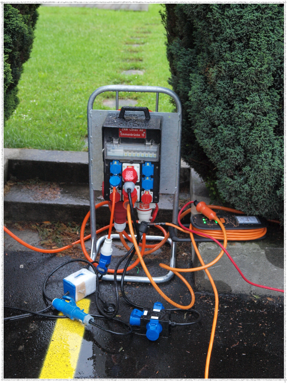 Auch ich beteilige mich an diesem Tanz und versuche heimlich einen CEE32A-Stecker in eine CEE63A-Dose zu stecken – passt nicht. Warum immer so pingelig? Alle anderen Dosen sind bereits belegt. Ich folge dem dicken orangen Kabel und stoße auf einen weiteren Verteilerkasten der noch nicht so überlastet zu sein scheint. Aber schon die nächste Überraschung. Die Schweizer haben doch einfach Steckdosen verbaut in die mein Schuko-Stecker nicht hinein passt. Immer müssen die ihr eigenen Käse-Fondue kochen. Aber da ist ja noch eine 16A CEE frei. Flugs habe ich den passenden Adapter aus dem Fundus im Kofferraum gefischt. Dabei mache ich mir nichts daraus das mit dabei das Wasser von der Heckklappe in den Nacken läuft – wenn ein Elektrofahrer eine Steckdose sucht ergreift ihn ein Fieber das sich am ehesten mit dem Fieber auf einer Grosswildjagt vergleichen.