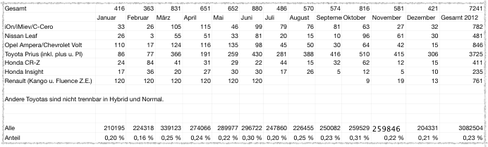 Renault - Renault verkauft den Kango sowohl als Verbrenner als auch als Elektrovariante. Leider ist aus der Statistik des Kraftfahrbundesamtes die Verteilung nicht ersichtlich. Der Renault ZOE ist noch nicht erhätlich und der Twizzy zählt nicht als KFZ und taucht in der Statistik nicht auf. Die Renault-Zahlen sind ungefähre Werte die auf den Aussagen des Herstellers beruhen, die zudem nur für den Zeitraum Januar-Mai vorhanden sind.